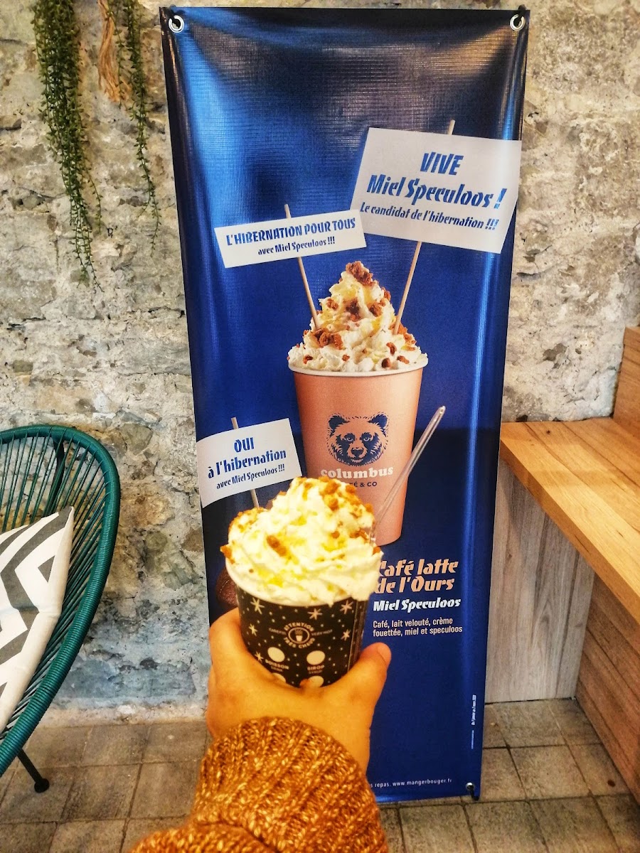 Café, lait, arôme spéculoos et crème fouettée parsemée de spéculoos concassés et de miel
